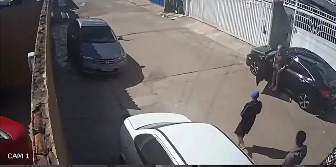 Uma mulher aparece logo depois e ajuda a vítima a se levantar, enquanto os suspeitos entram no carro e tentam dar a partida.