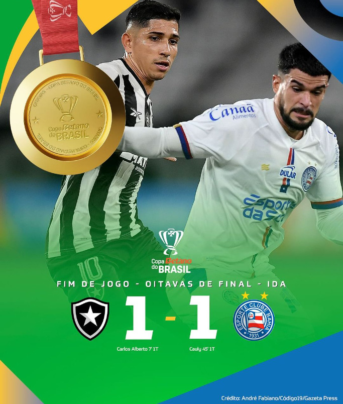 Botafogo e Bahia empataram em 1 a 1 na terça-feira, no Estádio Nilton Santos, no primeiro confronto das oitavas de final da Copa do Brasil. Carlos Alberto e Cauly marcaram os gols ainda no primeiro tempo, deixando a decisão completamente aberta para o jogo de volta.