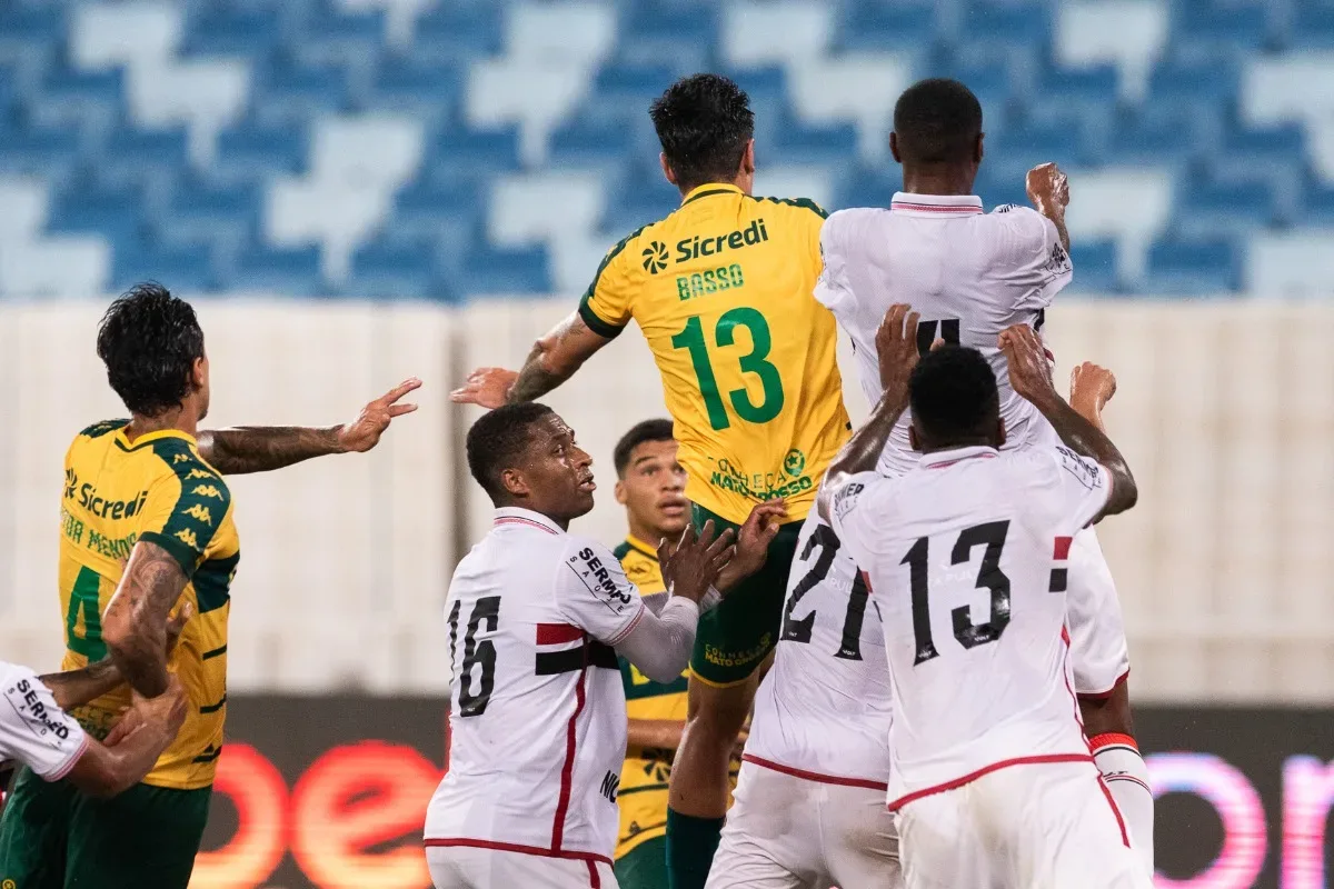 Quando o time mato-grossense tentava segurar o resultado, veio o castigo. Em lance dentro da área, a bola bateu na mão de Weverson e a arbitragem marcou pênalti para o Botafogo-SP. Luizão cobrou com firmeza e empatou a partida.