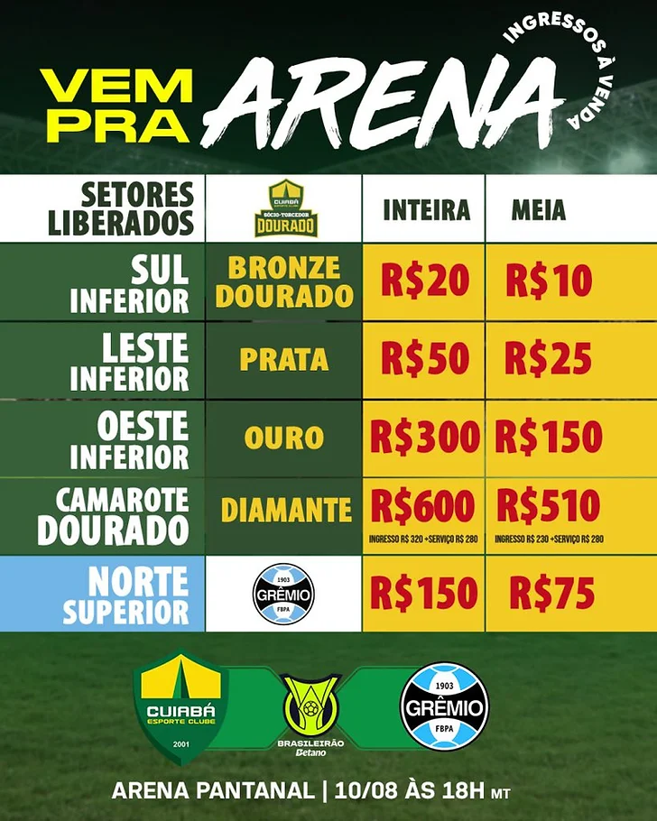 Assim, os torcedores do Cuiabá têm a chance de adquirir ingressos a preços acessíveis, especialmente no setor Sul. Por outro lado, os torcedores do Grêmio devem adquirir seus ingressos para o setor Norte Superior.