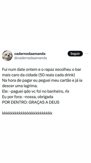 Pelo visto, a conta chegou e a reação foi imediata: a pessoa já se preparava para o pior, mas o parceiro(a) foi mais rápido e assumiu a conta. A gente torce pra que pelo menos a conversa tenha valido a pena!