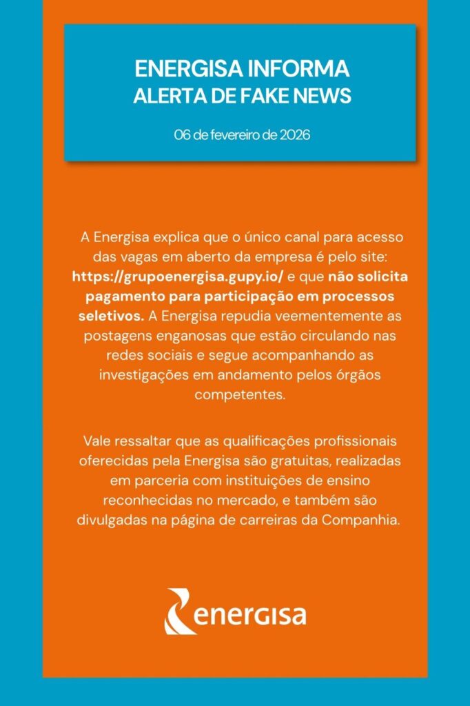 A empresa reafirma que divulga todas as vagas exclusivamente em seus canais oficiais e que mantém parcerias com instituições de ensino sérias para oferecer qualificações gratuitas. A Energisa informou que acompanha as investigações junto aos órgãos de segurança e que seguirá colaborando com as autoridades para punir os responsáveis.