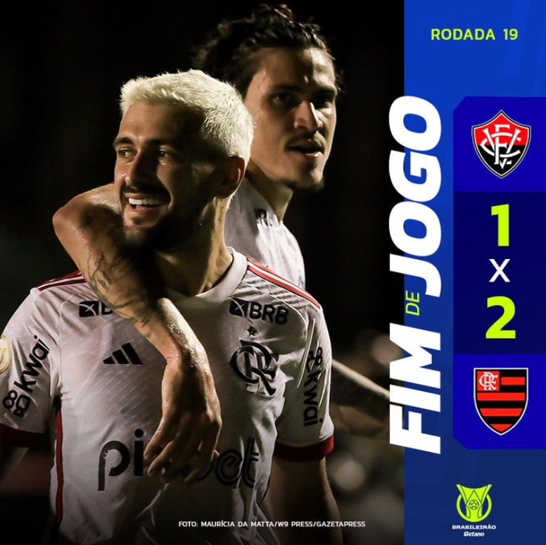 Na noite de quarta-feira (24), o Flamengo conquistou uma vitória crucial contra o Vitória por 2 a 1 no Barradão. Primeiro, De Arrascaeta abriu o placar na primeira etapa. Em seguida, Everaldo empatou para o Vitória no início do segundo tempo. No entanto, Carlinhos garantiu os três pontos para o time rubro-negro aos 45 minutos do segundo tempo, selando a vitória.