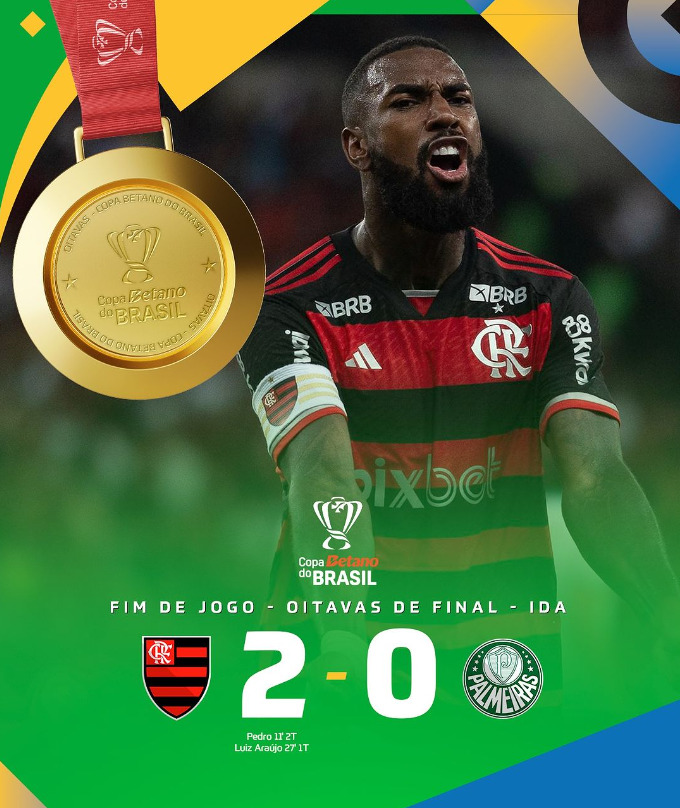 Na noite desta quarta-feira (31), o Flamengo venceu o Palmeiras por 2 a 0 no Maracanã, dominando o jogo do início ao fim. Com gols de Luiz Araújo e Pedro, a equipe carioca conquistou uma vantagem importante para o jogo de volta das oitavas de final da Copa do Brasil.