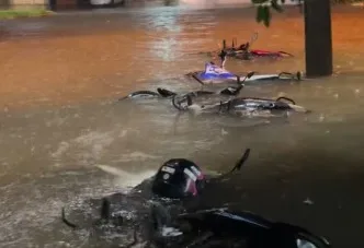 Em algumas localidades, a força da água arrastou motocicletas. Imagens e relatos mostram que parte dos veículos ficou parcialmente ou totalmente submersa.
