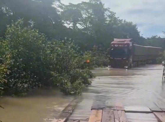 O volume intenso de chuva elevou o nível dos rios em poucas horas. Como consequência, a água ultrapassou a altura das pontes e tomou conta da pista. As imagens registradas no local mostram apenas a correnteza passando onde antes havia passagem segura.