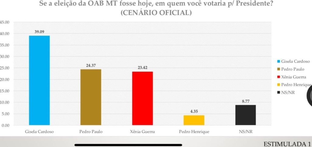 A atual presidente da Ordem dos Advogados do Brasil – Seccional Mato Grosso (OAB-MT), Gisela Cardoso, lidera a corrida eleitoral para sua reeleição, conforme aponta pesquisa do IDOC, instituto vinculado ao Portal O Documento e à TV Cuiabá. No cenário estimulado, em que os nomes dos candidatos são apresentados aos entrevistados, Gisela aparece com 39,09% das intenções de voto. A eleição da OAB-MT ocorrerá no próximo dia 18 de novembro, e a disputa se intensifica à medida que a data se aproxima.