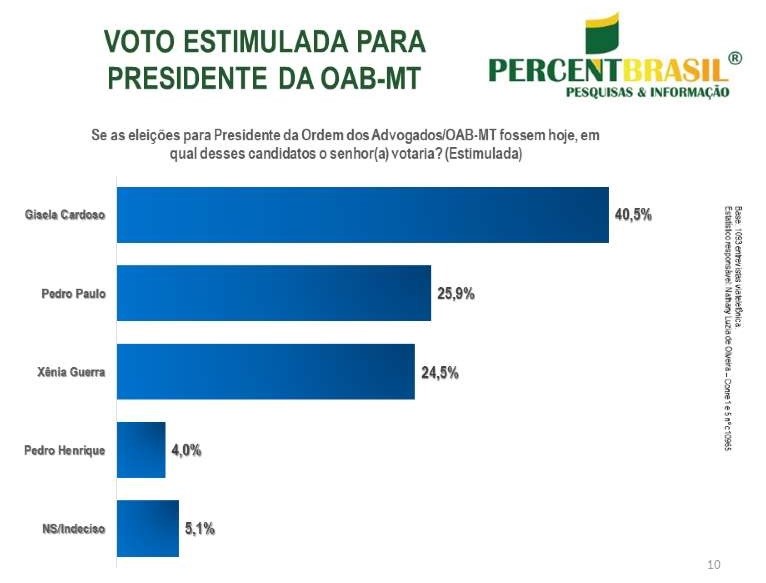 Gisela Cardoso, atual presidente da OAB-MT, lidera a corrida à reeleição com 40,5% das intenções de voto, conforme apontou uma pesquisa realizada pela Percent Brasil. O levantamento ouviu 1093 advogados em Cuiabá e nas 29 subseções da OAB em Mato Grosso entre os dias 11 e 14 de novembro. Com uma margem de erro de 3%, os dados foram coletados na modalidade estimulada, o que indica a preferência consolidada dos eleitores nesse momento.