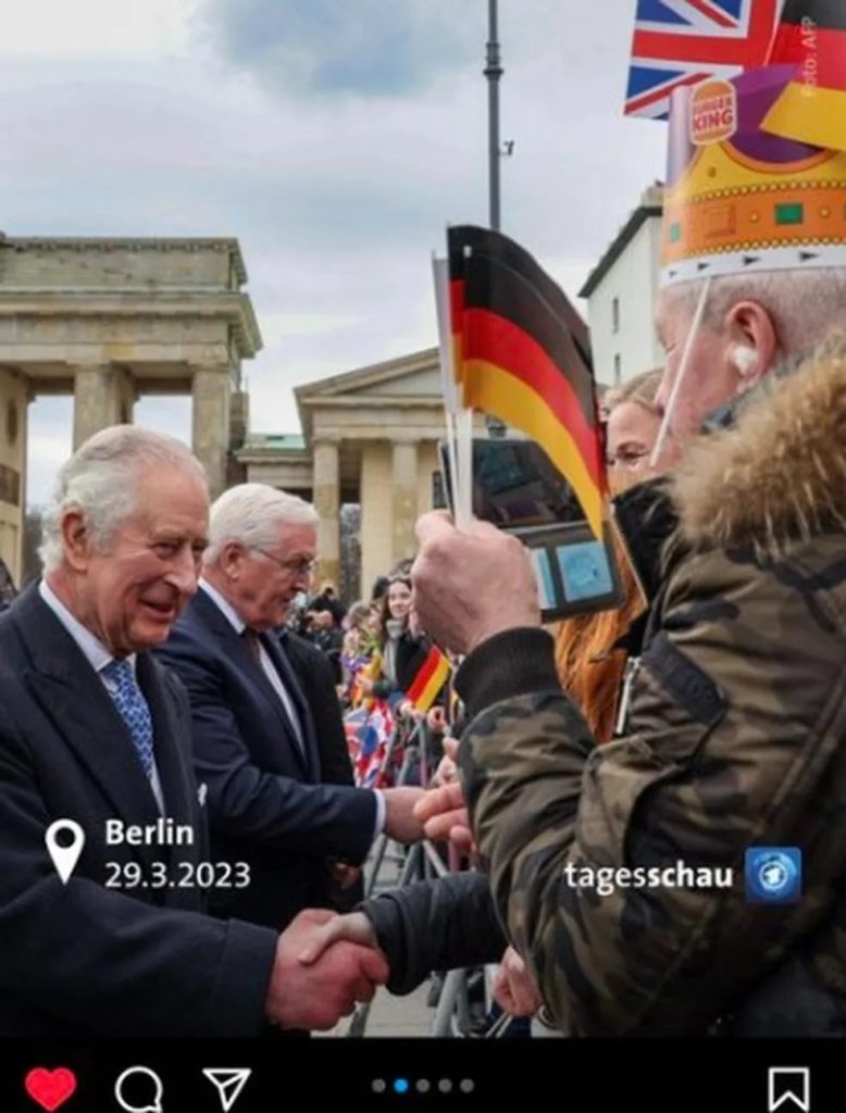 A “coroação” de Charles III quase “aconteceu” durante visita à Alemanha na quarta-feira. Quando o rei era saudado por uma multidão em Berlim, um homem se aproximou e ofereceu uma coroa: uma de papel ofertada pelo Burger King.