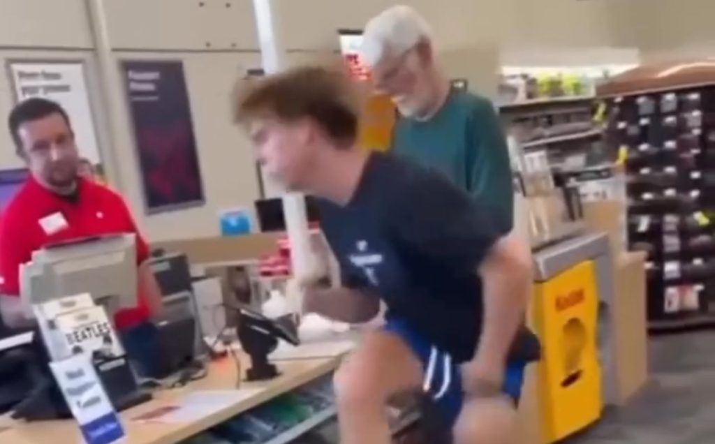 No vídeo, o jovem realiza uma performance inusitada, imitando um cavalo, pulando e fazendo barulho em frente ao caixa. Inicialmente, o atendente tentou controlar a situação e pediu ao jovem que parasse e saísse do local. No entanto, o rapaz não mostrou qualquer intenção de interromper o comportamento. Diante disso, o atendente, visivelmente desconfortável com a situação, informou ao jovem que, caso ele não saísse, chamaria a polícia. Assim, o comportamento do rapaz não apenas gerou confusão, mas também colocou o atendente em uma posição difícil, onde teve que tomar medidas drásticas.