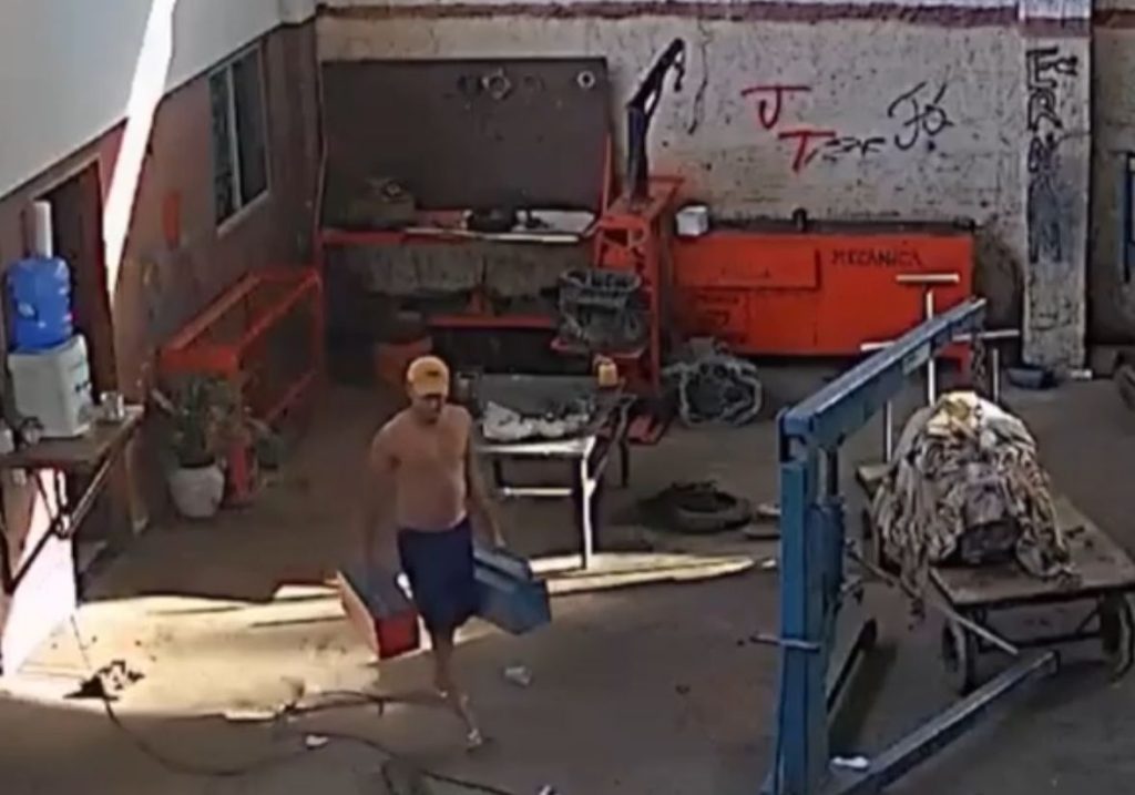 O vídeo mostra o suspeito sem camisa, dirigindo um Fiat Palio. Ele estaciona o veículo em frente à oficina, desce com rapidez, entra no imóvel e recolhe ferramentas. Em seguida, volta ao carro e foge. O dono só percebeu o crime alguns minutos depois e acionou a Polícia Militar, que iniciou buscas na região. Até agora, as equipes não localizaram o responsável.