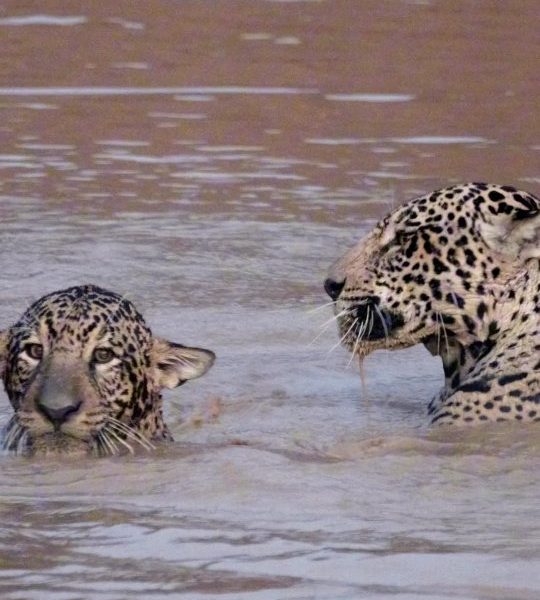 As onças-pintadas nadam para se refrescar, caçar e ensinar habilidades de sobrevivência aos filhotes.