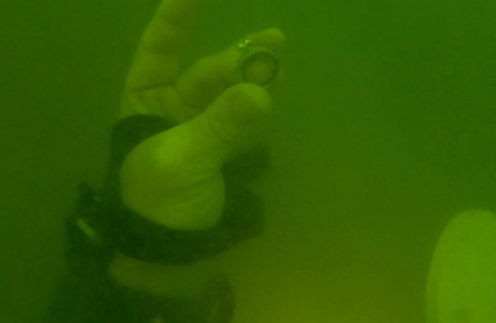 Depois de mexer em alguns galhos e latas afundados no lodo espesso, o mergulhador puxou o que pensou ser uma tampa de garrafa. “Mas, em vez disso, estava olhando para um diamante enorme. Era a aliança de casamento! Estava muito animado, especialmente porque sabia quão pequenas eram as chances de eu realmente encontrá-lo”, comenta o americano no YouTube.