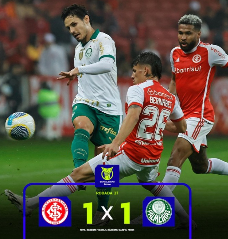 Na noite deste domingo, no Beira-Rio, o Palmeiras conseguiu empatar com o Inter nos minutos finais, interrompendo assim uma série de três derrotas consecutivas. Bruno Henrique abriu o placar para o Colorado com um golaço no primeiro tempo. No entanto, Rony igualou para o Verdão já na reta final, após uma revisão do VAR. A partida contou com dois gols anulados de Lázaro por impedimento e ampliou a sequência sem vitórias do Inter para 11 jogos sob o comando de Roger Machado.