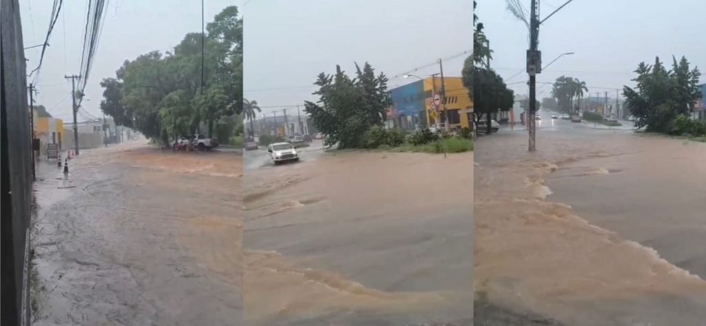 Moradores do bairro Jardim Imperial, em Cuiabá, registraram na manhã desta quinta-feira (26) ruas completamente alagadas após o transbordamento de um córrego. A forte chuva atingiu diversos bairros desde as 6h, provocou transtornos, dificultou a mobilidade e elevou o nível de alerta entre os moradores.