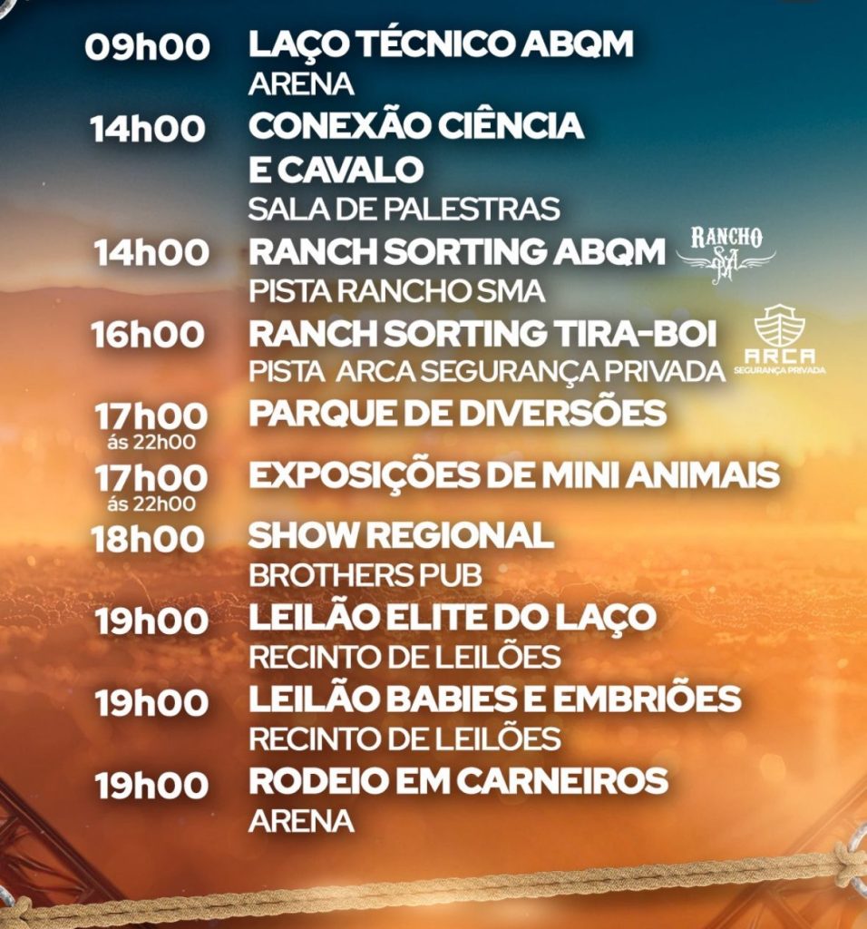 A programação segue até o dia 15 de março e reúne atividades para diferentes públicos. O evento inclui rodeio em carneiros, competições equestres, feira de negócios e apresentações musicais.