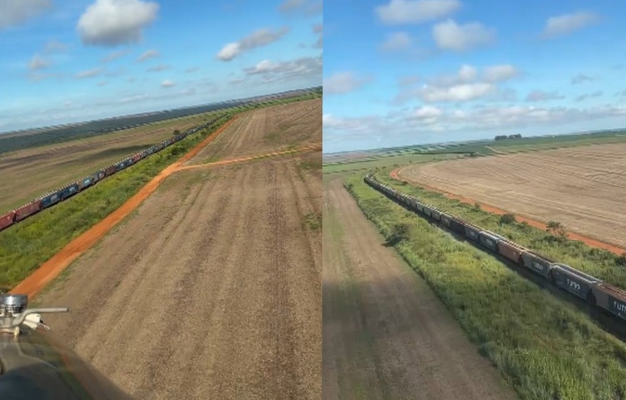 Um vídeo gravado por um avião ganhou repercussão nas redes sociais ao mostrar um trem de grande extensão cruzando uma área rural de Mato Grosso. As imagens revelam a dimensão da composição e integram o trem à paisagem típica do Centro-Oeste brasileiro.