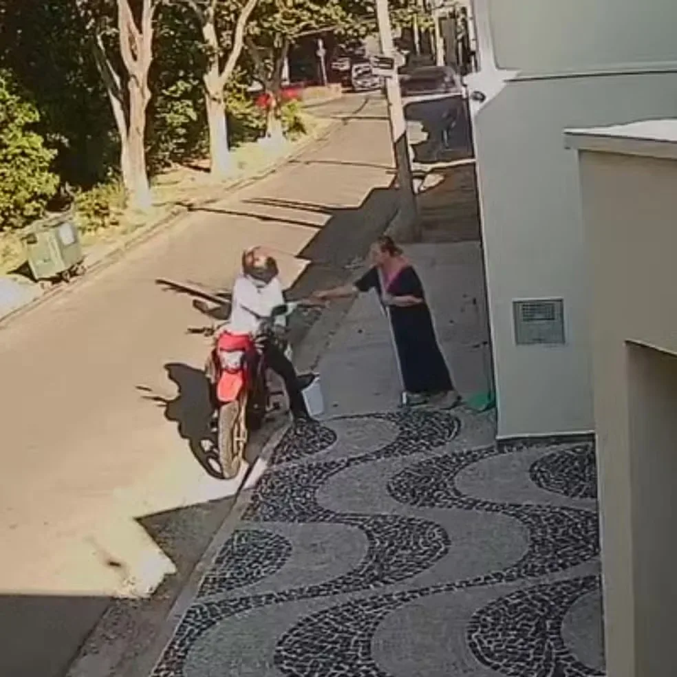 Uma mulher teve a aliança roubada por um homem em uma moto enquanto varria a calçada, na manhã desta sexta-feira (24), no bairro do Taquaral, em Campinas. A ação durou poucos segundos e câmeras de segurança registraram toda a abordagem. O crime ocorreu na Rua Ary Barroso. Nas imagens, o suspeito se aproxima da vítima e, em seguida, realiza a abordagem de forma rápida. Logo depois, ele foge do local, o que evidencia a agilidade da ação.