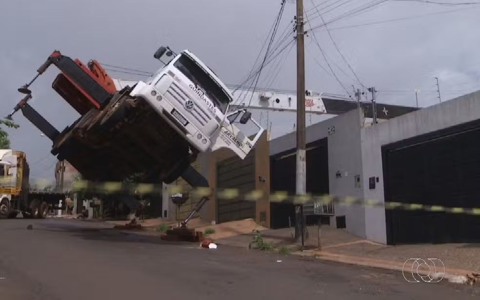 Câmeras de segurança registraram o momento em que um guindaste caiu em cima de duas casas durante a instalação de uma piscina, em Rio Verde, no sudoeste de Goiás. O vídeo mostra quando as rodas do caminhão saem do chão. Também é possível ver o desespero de um homem na rua.
