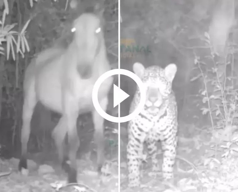 Câmera escondida mostra que cavalo conseguiu escapar do ataque de uma onça na floresta brasileira